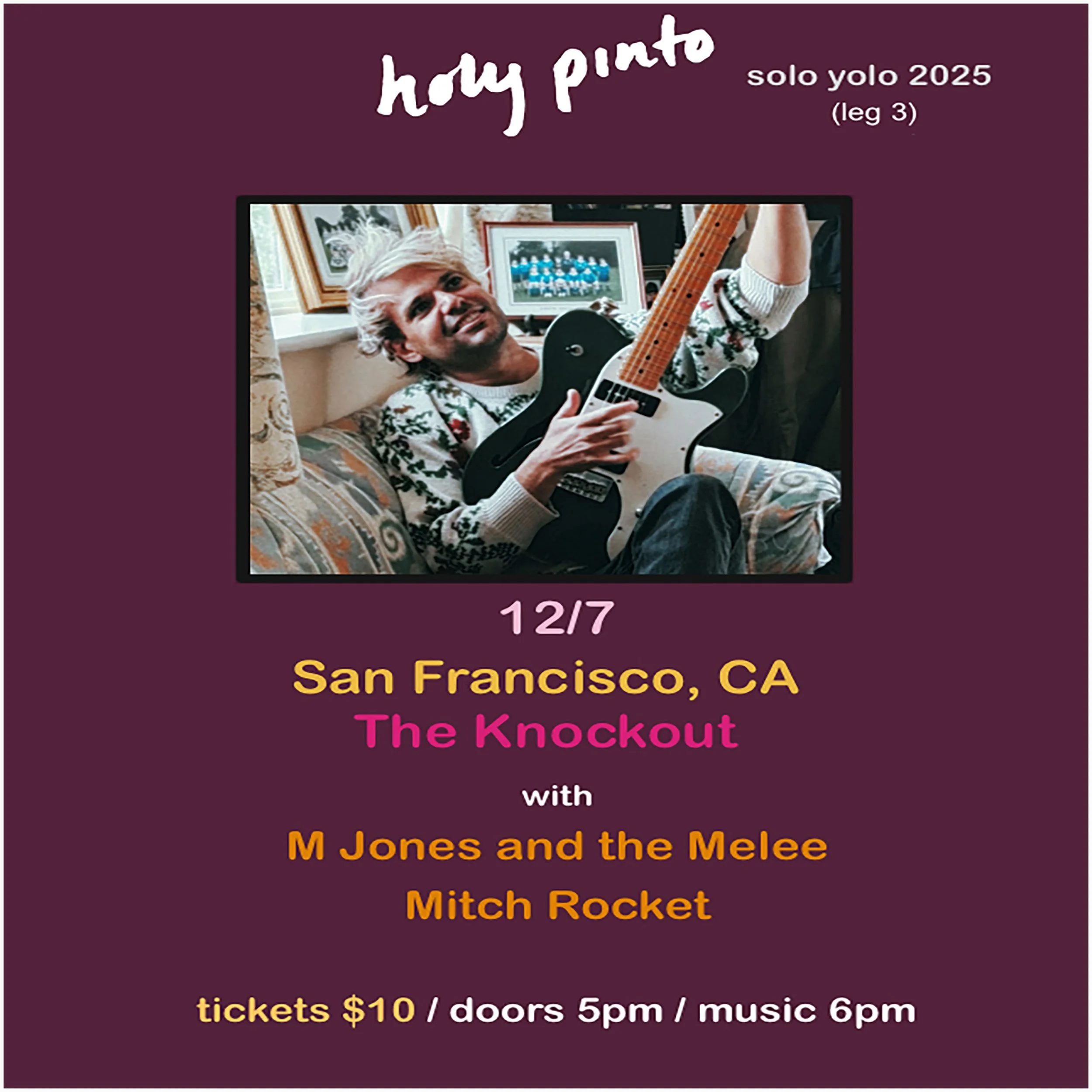 Back to All Events SATURDAY MATINEE SHOW WITH MUSIC BY HOLY PINTO + M JONES AND THE MELEE + MITCH ROCKET Sunday, December 7, 2025 5:00 PM 9:00 PM Google Calendar ICS SATURDAY MATINEE SHOW WITH MUSIC BY HOLY PINTO (MILWAUKEE / UK) + M JONES AND THE MELEE + MITCH ROCKET | SATURDAY AFTERNOON INDIE POP & A LITTLE PANIC ATTACK ROCK N’ ROLL! | DOORS 5PM | SHOW 6PM TO 9PM | $10 | 21+