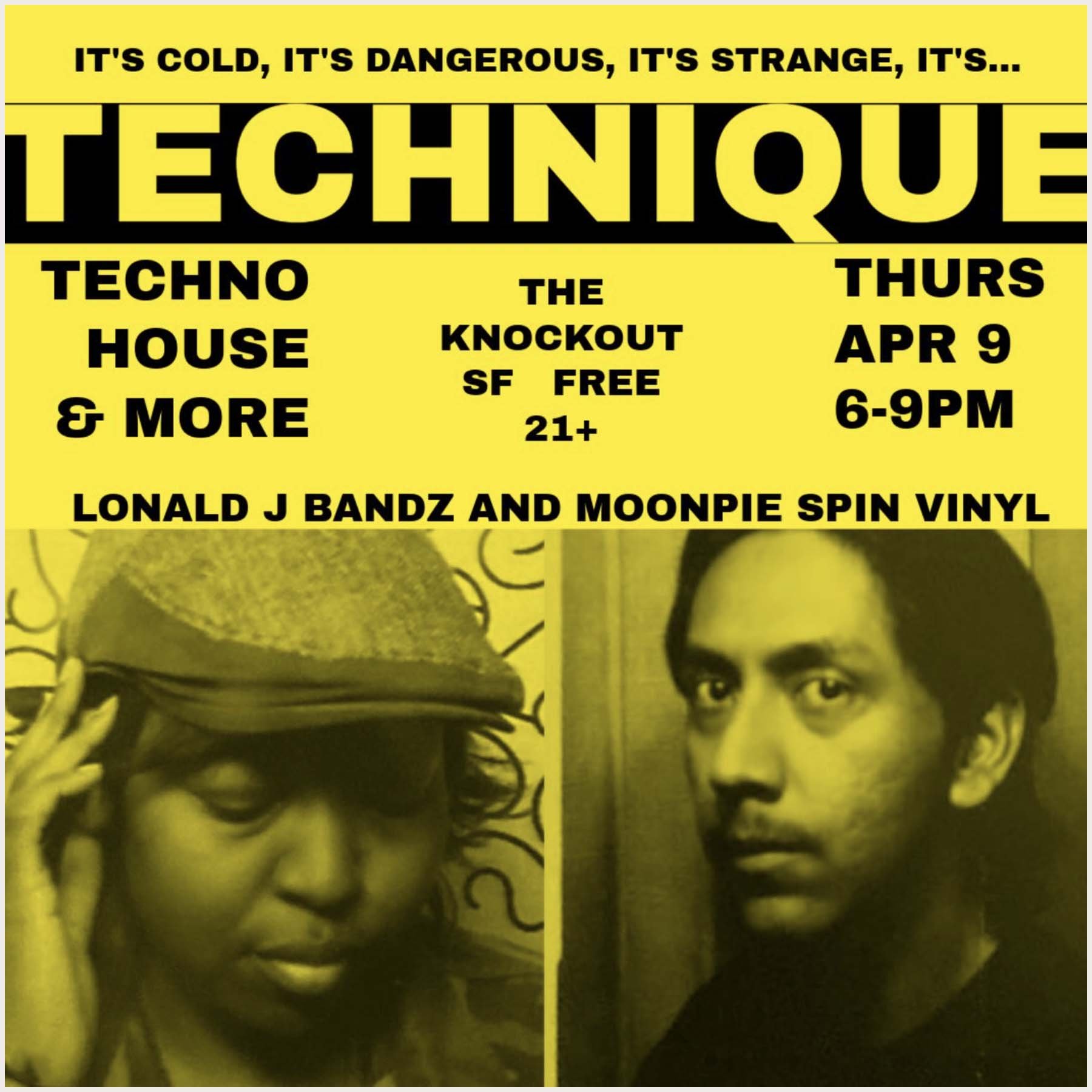 TECHNIQUE TECHNO HOUSE HAPPY HOUR DANCE PARTY WITH DJ MOONPIE & DJ LONALD J BANDZ • ALL VINYL SELECTIONS • 6PM TO 9PM • NO COVER • 21+