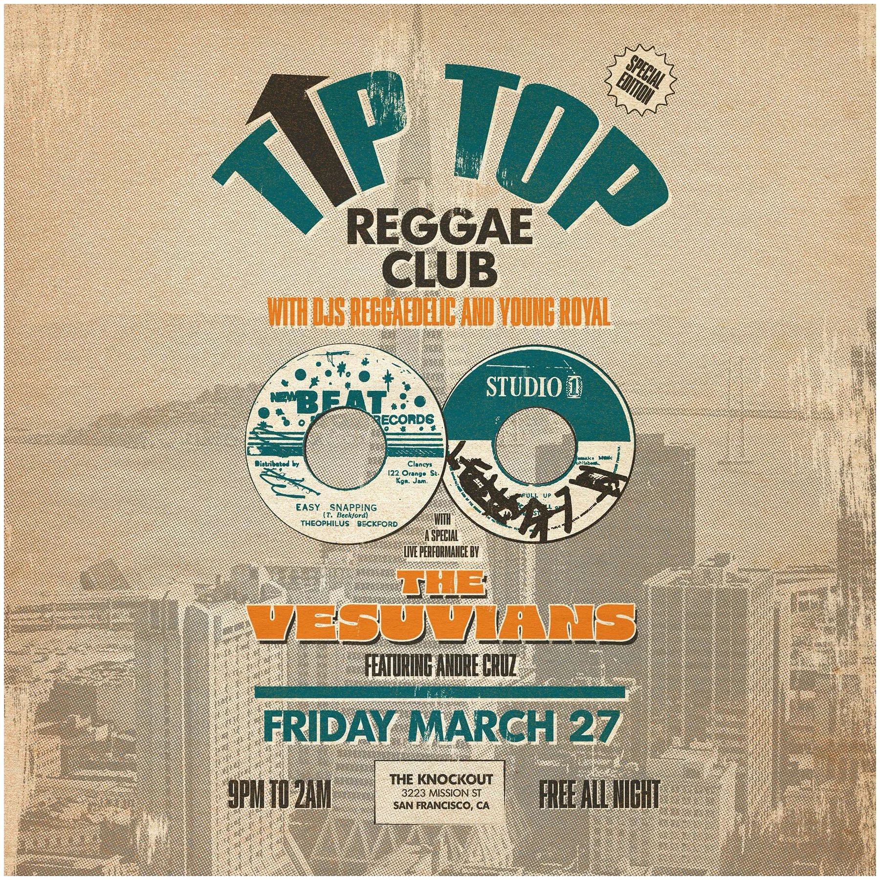 THE TIP TOP REGGAE CLUB WITH YOUR HOSTS AND RESIDENT DJs REGGAEDELIC AND YOUNG ROYAL AT THE TURNTABLES! PLUS A VERY SPECIAL LIVE PERFORMANCE FROM THE VESUVIANS FEATURING ANDRE CRUZ! IT’S A REGGAE ROCKSTEADY HULLABALOO ALL NIGHT LONG! DON’T YOU DARE MISS IT MON! • 9PM TO CLOSE • NO COVER • 21+