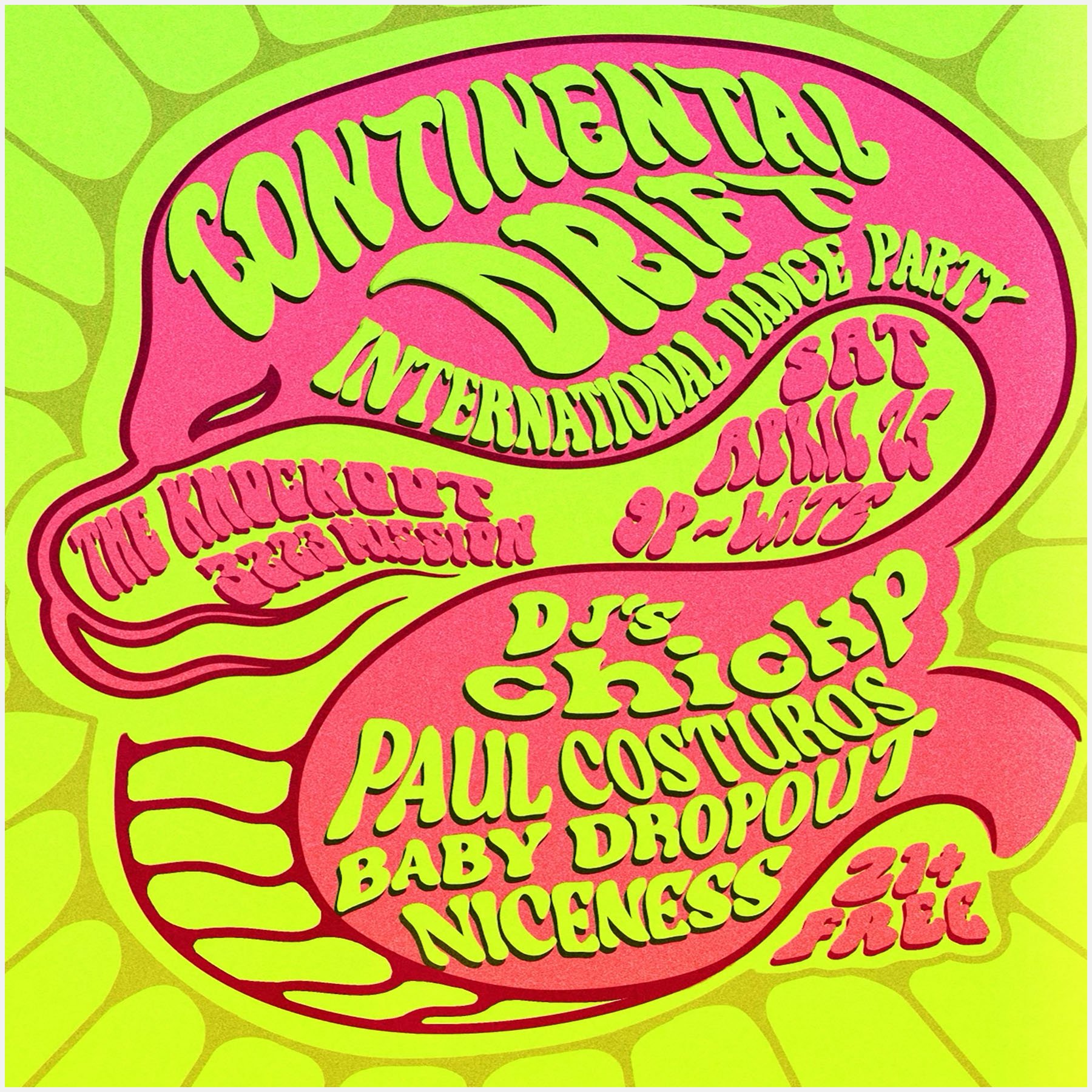 CONTINENTAL DRIFT : INTERNATIONAL VIBES DANCE PARTY (9PM - CLOSE) Saturday, April 25, 2026 9:00 PM Sunday, April 26, 2026 2:00 AM Google Calendar ICS CONTINENTAL DRIFT : INTERNATIONAL VIBES DANCE PARTY FEATURING TUFF GLOBAL GROOVES ON VINYL. DJ CHICK P. DJ PAUL COSTUROS. DJ NICENESS. DJ BABY DROPOUT. A DANCE PARTY FOR GOOD PEOPLE EVERYWHERE! • 9PM TO CLOSE • NO COVER • 21+
