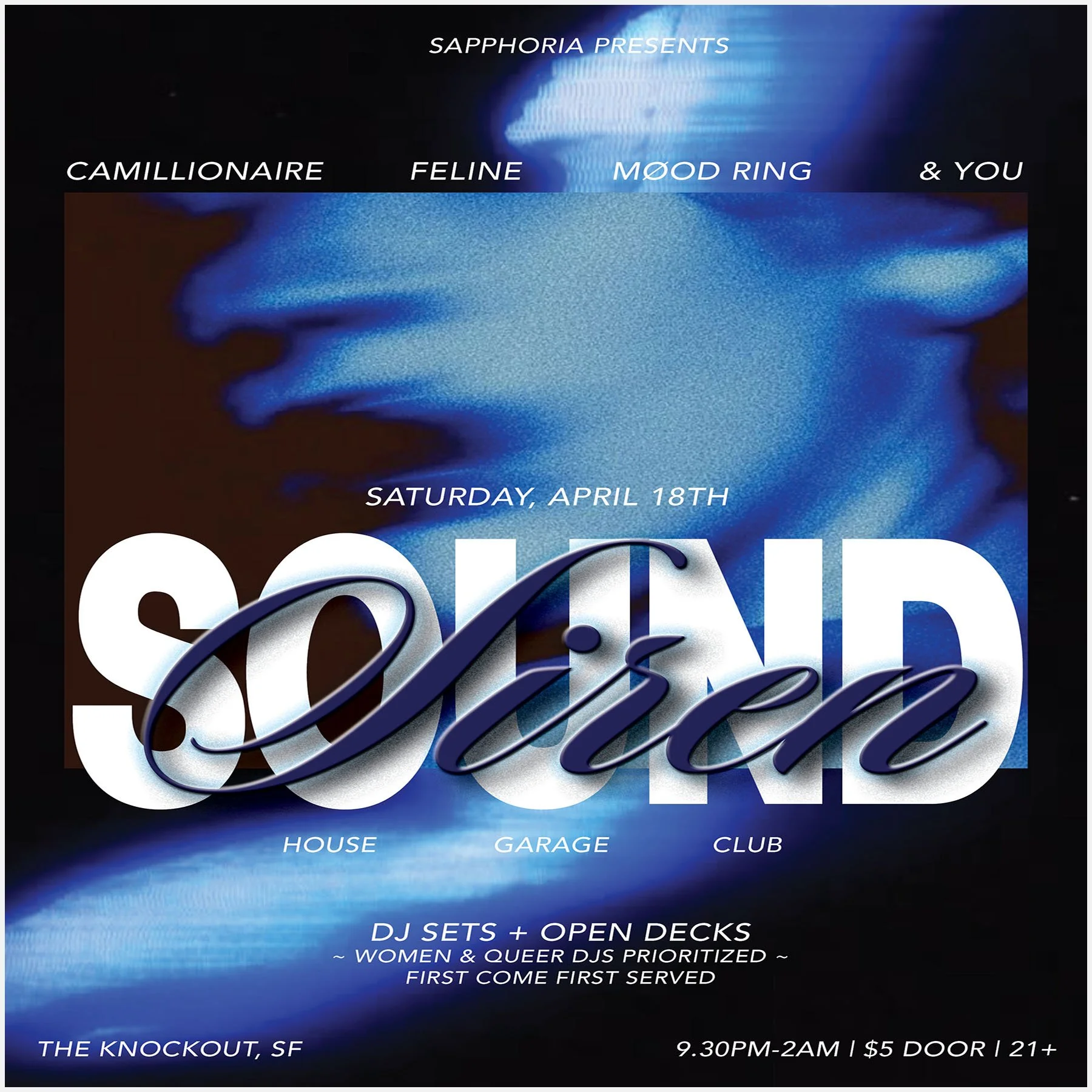 Back to All Events SIREN SOUND OPEN DECKS DANCE PARTY (9PM - CLOSE) Saturday, April 18, 2026 9:00 PM Sunday, April 19, 2026 2:00 AM Google Calendar ICS SIREN SOUND OPEN DECKS DANCE PARTY WITH HOSTING DJs CAMILLIONAIRE + FELINE + MOOD RING AND YOU! HOUSE! GARAGE! CLUB! STRICTLY VINYL! FIRST COME, FIRST SERVED • DOORS 9PM • SHOW 930PM TO CLOSE • $5 • 21+