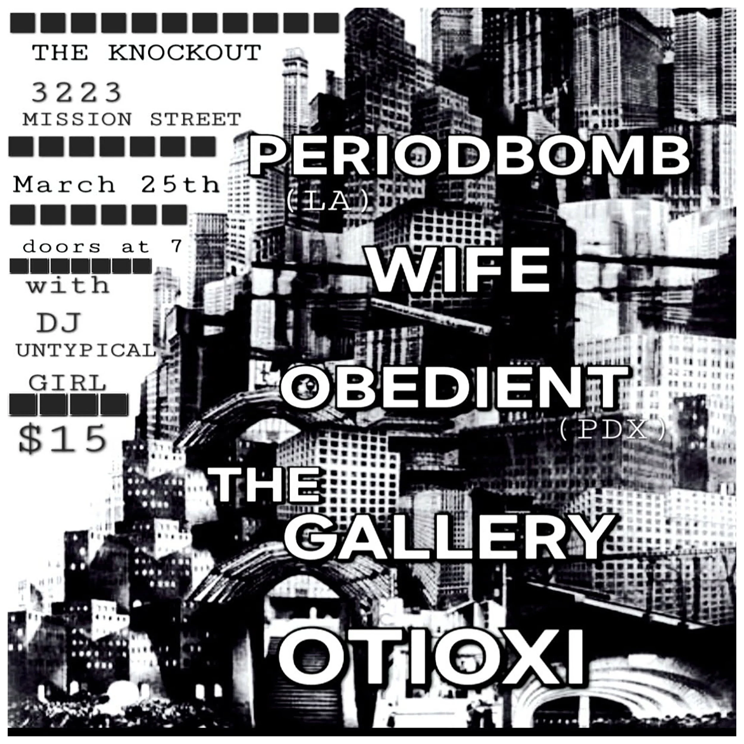 OBEDIENT (PDX) + PERIOD BOMB (LOS ANGELES) + THE GALLERY + WIFE + OTIOXI + DJ UNTYPICAL GIRL ON THE RECORD MACHINES • LOUD. SCREAMING. FULL THROTTLE. RIOT GRRRL. NO. WAVE. ROCK N’ ROLL. AT. MAXIMUM. VOLUME. BE FOREWARNED. • DOORS 8PM • SHOW 9PM TO CLOSE • $15 • 21+