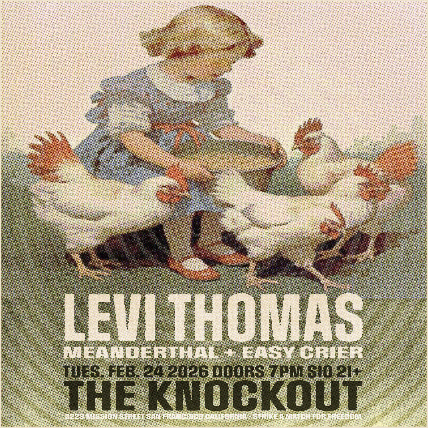 LEVI THOMAS + MEANADERTHAL + EASY CRIER (7PM - CLOSE) Tuesday, February 24, 2026 7:00 PM 11:59 PM Google Calendar ICS TUESDAY NIGHT LIVE PRESENTS LEVI THOMAS + MEANADERTHAL + EASY CRIER • A PSYCHEDELIC SINGER SONGWRITER FOLK POP KINDDA NIGHT • DOORS 7PM • SHOW 8PM TO CLOSE • $10 • 21+